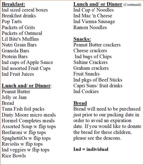 A list of recommended food can be found below. Please note that these children may not have adult assistance, therefore we need to have items that do not require the use of a can opener or a stove top.